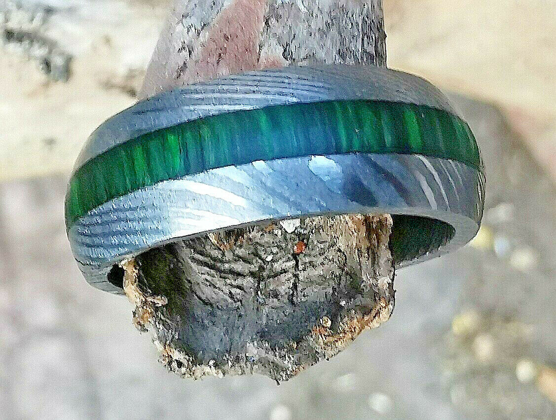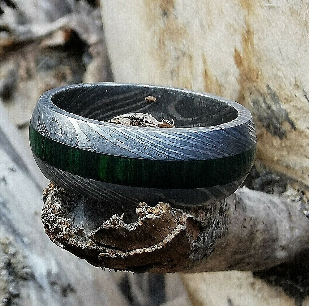 Here we have a custom hand-made Damascus ring, this 9 mm wide Damascus ring wood inlay has been acid finished causing parts of the steel to look dark. Each ring is custom made and the pattern unique, so no two rings are exactly alike. Damascus steel rings are very desirable. Your ring comes with a comfortable fit for extra satisfaction.