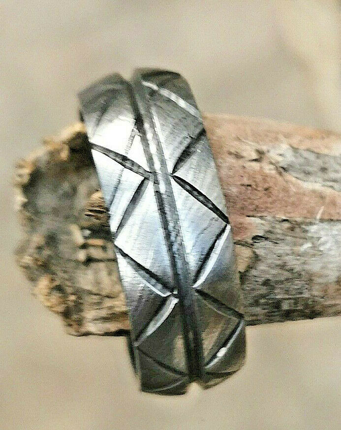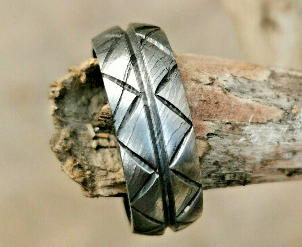 Here we have a custom hand-made Damascus ring, this 9 mm wide Damascus ring wood inlay has been acid finished causing parts of the steel to look dark. Each ring is custom made and the pattern unique, so no two rings are exactly alike. Damascus steel rings are very desirable. Your ring comes with a comfortable fit for extra satisfaction.