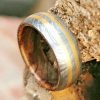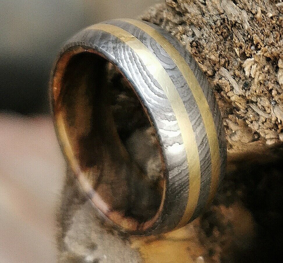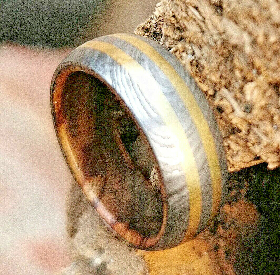 Here we have a custom hand-made Damascus ring, this 9 mm wide Damascus ring wood inlay has been acid finished causing parts of the steel to look dark. Each ring is custom made and the pattern unique, so no two rings are exactly alike. Damascus steel rings are very desirable. Your ring comes with a comfortable fit for extra satisfaction.